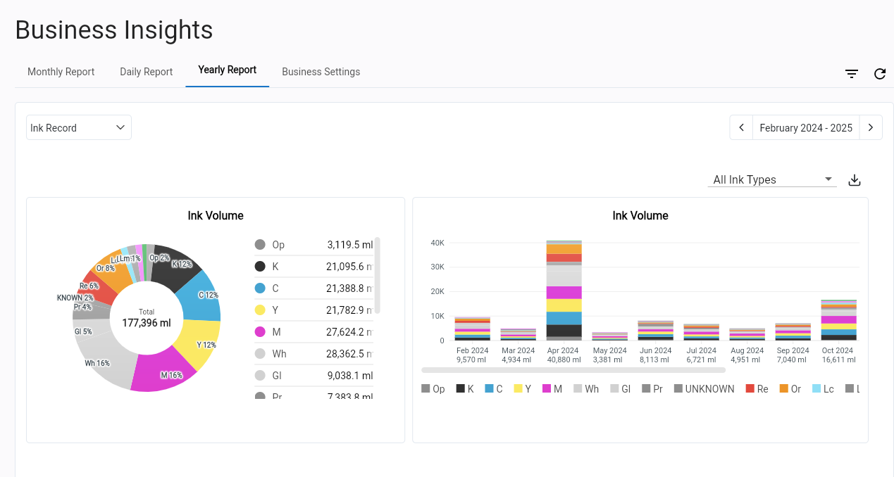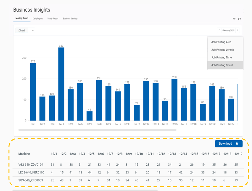 Roland DG Connect Business Insights provides detailed, time-based reporting on device performance, ink usage, and print activity—helping businesses track productivity, identify trends, and plan with confidence.
